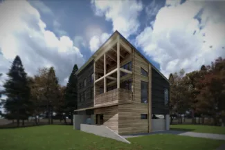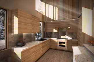 The home consists of 2 living rooms, a kitchen, 3 bedrooms, 2.5 bathrooms, a snow room, a garage, and a storage loft. The exterior balcony is intended to be used for outdoor grilling and hosting guests by extending the L2 living room to the exterior.